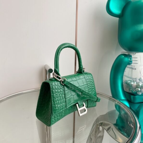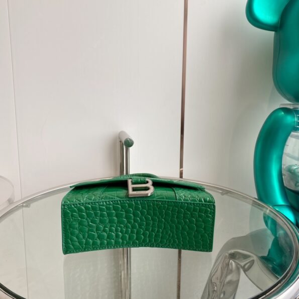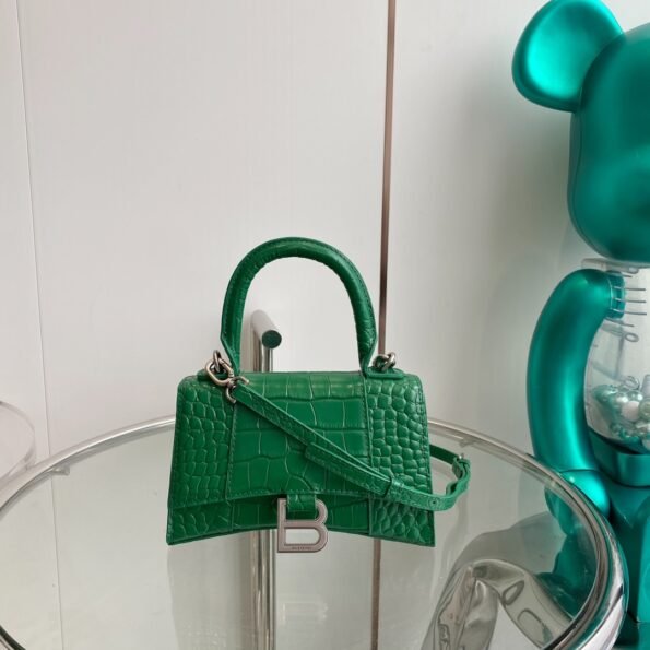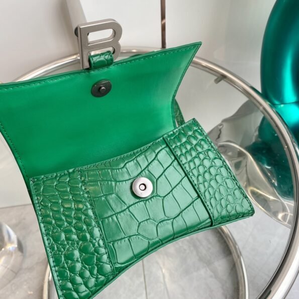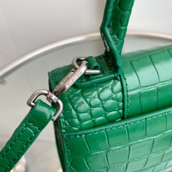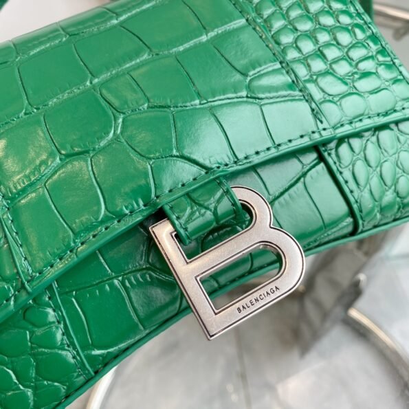 Balenciaga Hourglass XS. Bold curves, luxe croc-effect leather. Top handle & crossbody strap. Magnetic closure, int. zip pocket. Made in Italy.