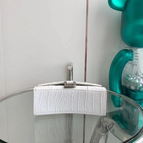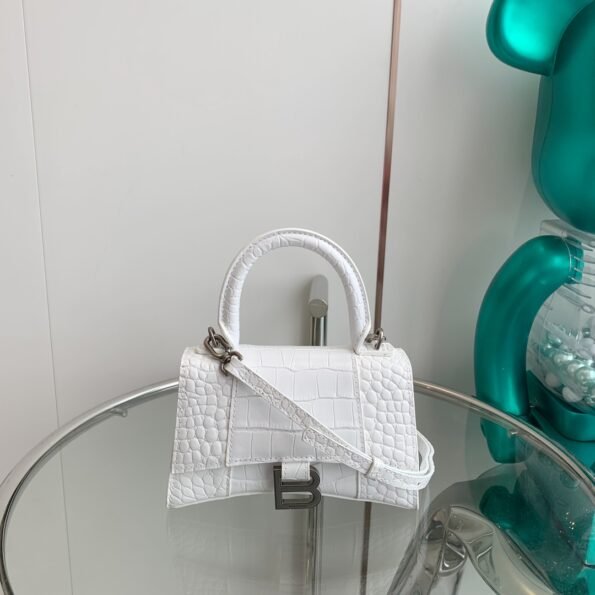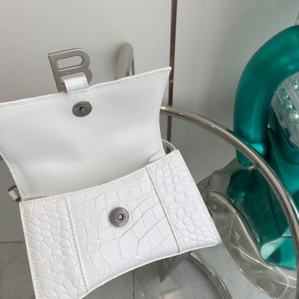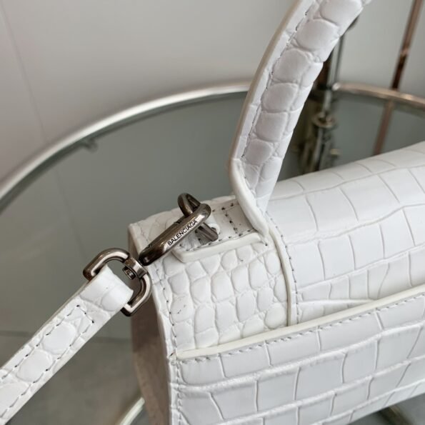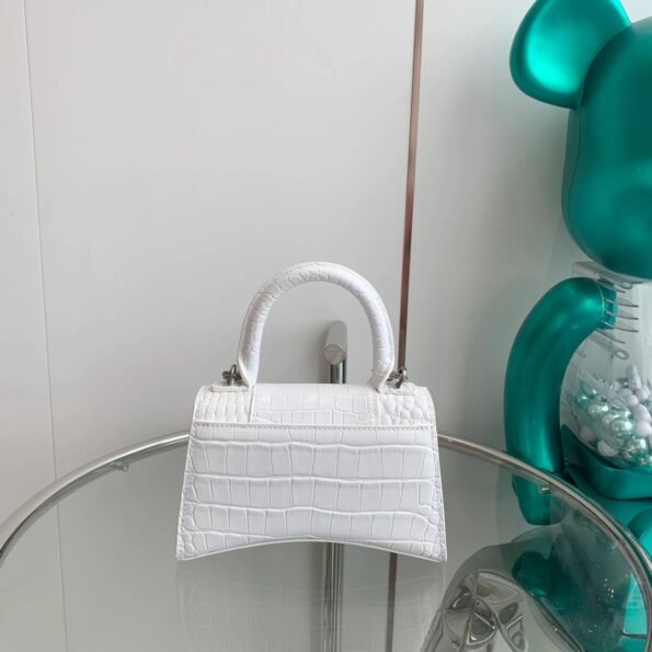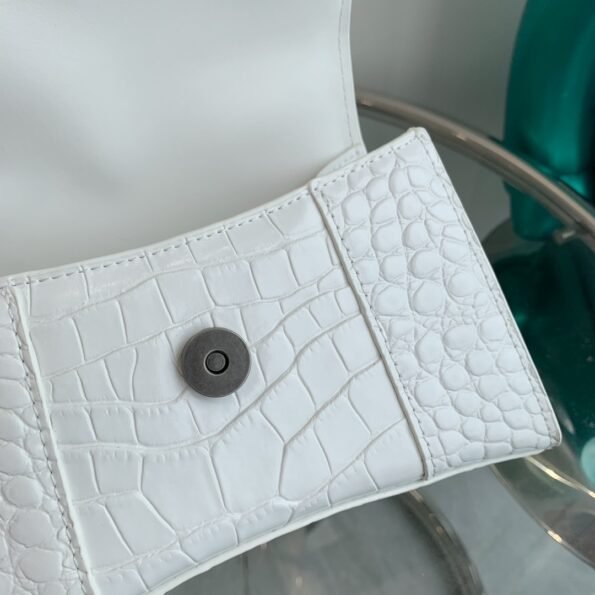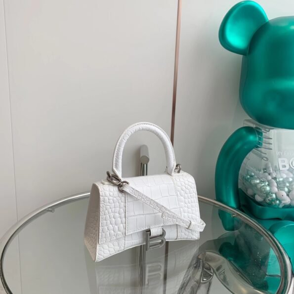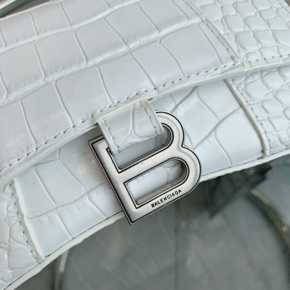 Balenciaga Hourglass XS. Bold curves, luxe croc-effect leather. Top handle & crossbody strap. Magnetic closure, int. zip pocket. Made in Italy.