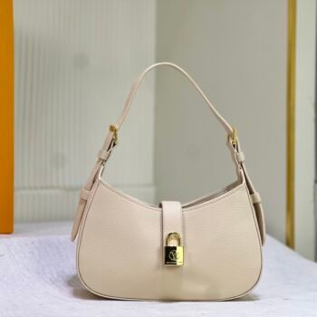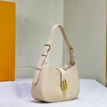 Calming quartz cowhide leather with classic elegance. Adjustable strap, suede lining & LV padlock closure. Size: 26x18x7cm.