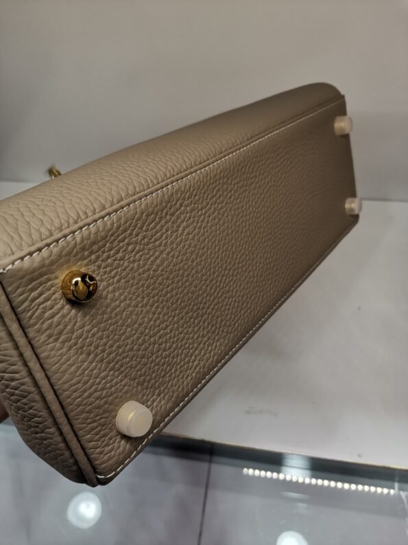 Luxuriously crafted in caramel cowhide leather. Adjustable strap, suede lining & LV padlock closure. Size: 26x18x7cm.