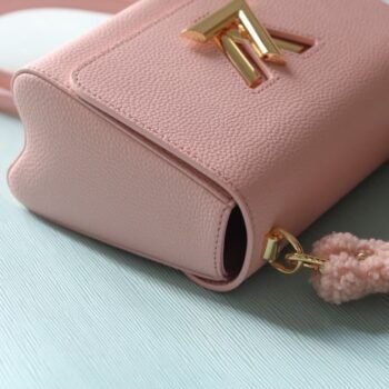 The Twist PM handbag in Jasmine Pink Taurillon leather, part of the LV Ski capsule, features a gold-color LV Twist lock, shearling-braided chain, and an adjustable, removable smart strap for versatile carrying. Dimensions: 19 x 15 x 9 cm.