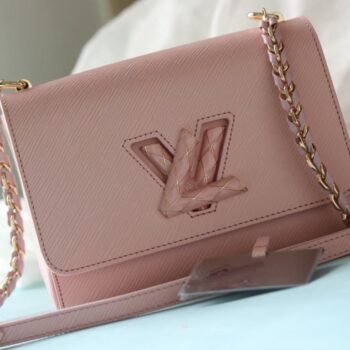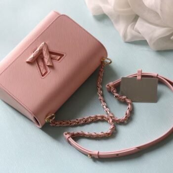 The Twist PM handbag in Rose Jasmin Epi leather features a tone-on-tone enamel LV Twist lock with a quilted effect. It offers a spacious “wave” base, a comfortable leather-braided chain, and multiple interior pockets. Dimensions: 19 x 15 x 9 cm.