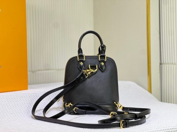 The Alma Backpack in Black Epi leather features a sleek design with an engraved padlock and leather key bell. It offers versatile carrying options with two adjustable, removable straps and a top handle. Perfect for stylish, modern use.