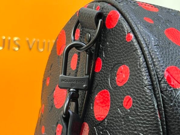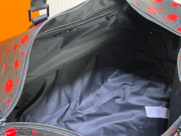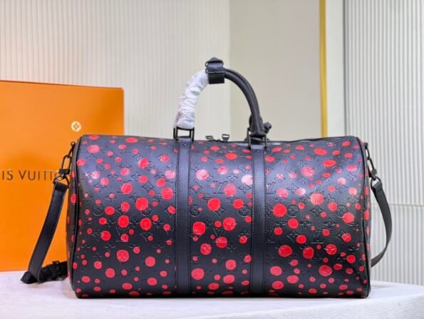 The LV x YK Keepall 50 travel bag in polka dot Taurillon Monogram leather is spacious and collectible. Dimensions: 50 x 29 x 23 cm.