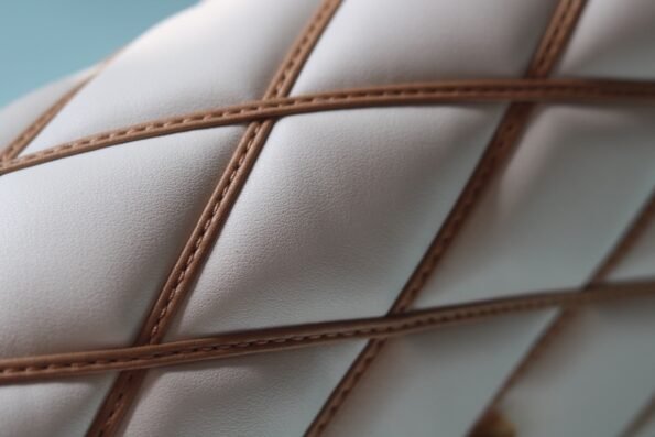 Futuristic twist! Hand-painted “roasted” effect on quilted sheepskin. Detachable handles & chain for multiple ways to carry. 23x16x10cm.