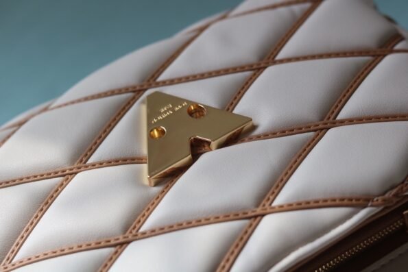This unique GO-14 handbag (M23568) by Nicolas Ghesquière features a hand-painted “roasted” effect on quilted sheepskin, creating a futuristic and avant-garde look.