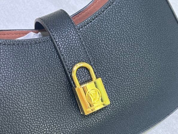 Crafted from soft black cowhide leather. Features adjustable strap, suede lining, and classic LV padlock closure for security. Size: 26x18x7cm.