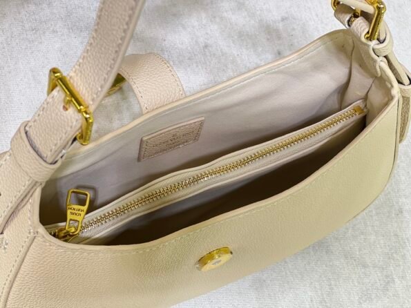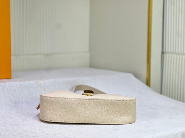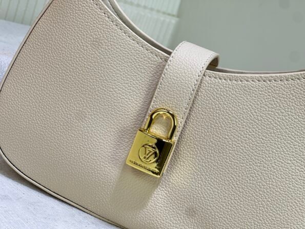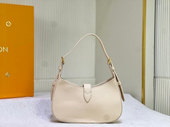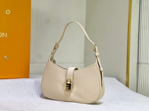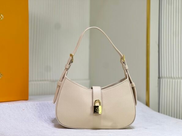 This elegant shoulder bag in a calming quartz hue (M24990) showcases Louis Vuitton’s renowned craftsmanship.