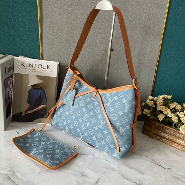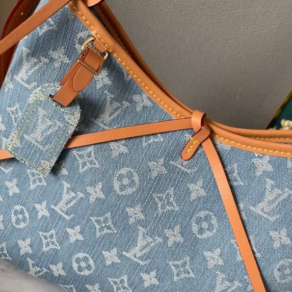 Introducing the new CarryAll Medium Handbag in official new color denim. Available in two sizes: Large (M46855 Blue) and Small (M46854 Blue). Crafted from Monogram canvas with leather trims, this handbag features a body-fitting design. It offers ample space with a zipper pocket and includes a detachable zipper clutch for added functionality. The handle length can be adjusted with a buckle for versatile carrying options.