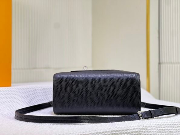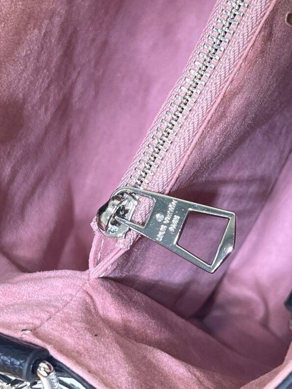 Crafted from soft black cowhide leather. Features adjustable strap, suede lining, and classic LV padlock closure for security. Size: 26x18x7cm.