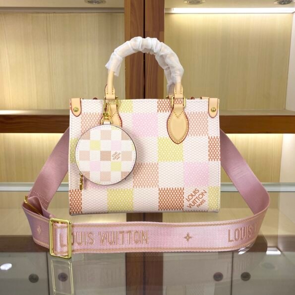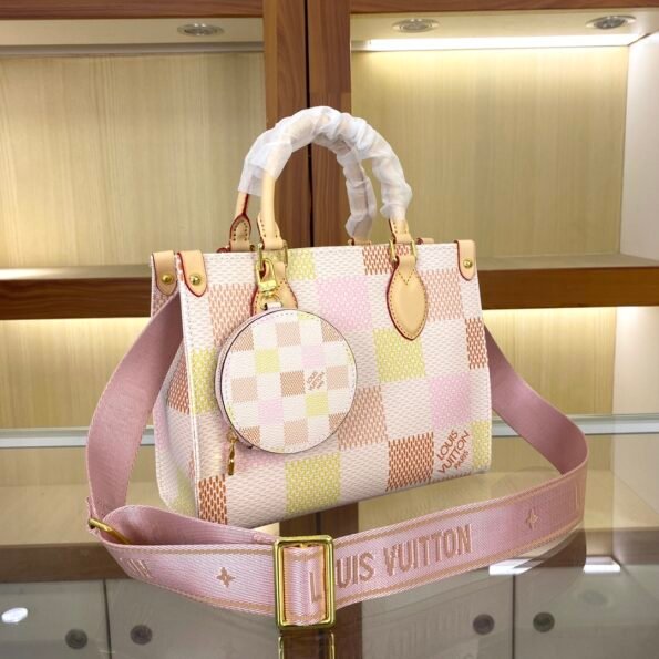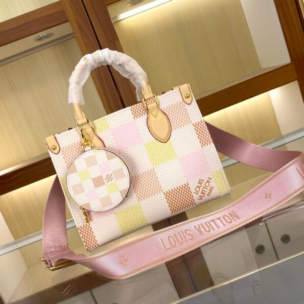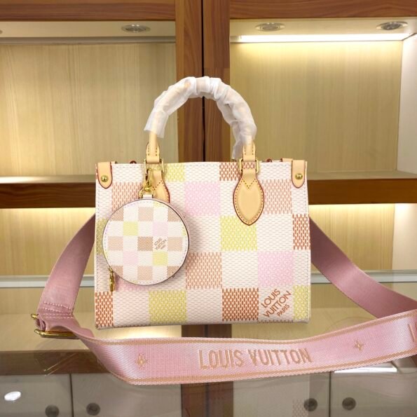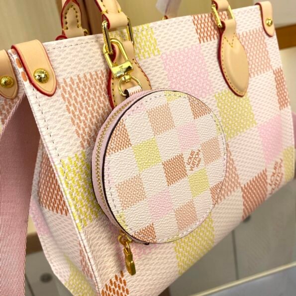 This OnTheGo small handbag features a new gradient pastel color rendition of Monogram canvas, adding a fresh spring vibe. The spacious interior accommodates a tablet, wallet, and mobile phone, complemented by a detachable round coin purse, jacquard shoulder strap, and Toron handle for versatile styling options.