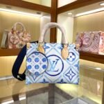 Introducing the Onthego Medium Handbag in new denim colors (M46993, M47054). Crafted from stonewashed Monogram jacquard denim with leather trim and contrast stitching, it offers ample capacity for both business and leisure. Features include exquisite handles and long shoulder straps for versatile carrying options.