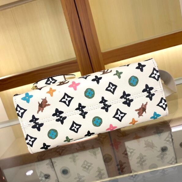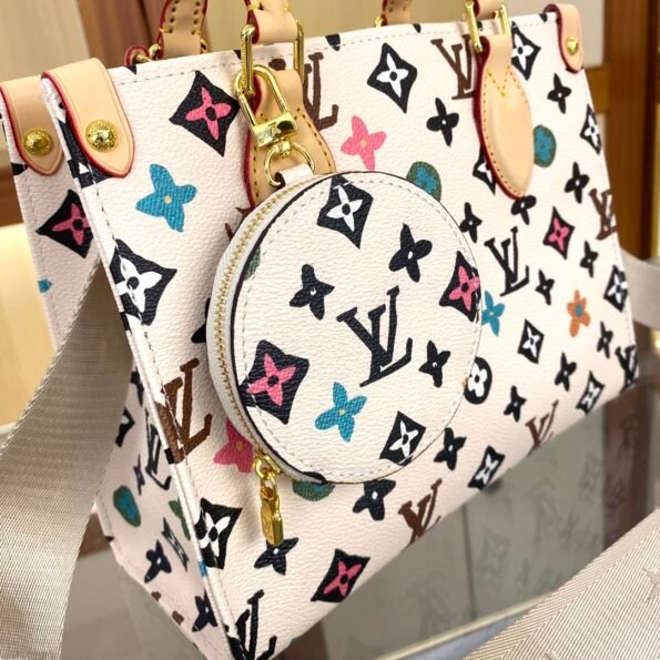 This OnTheGo small handbag features a new gradient pastel color rendition of Monogram canvas, adding a fresh spring vibe. The spacious interior accommodates a tablet, wallet, and mobile phone, complemented by a detachable round coin purse, jacquard shoulder strap, and Toron handle for versatile styling options.