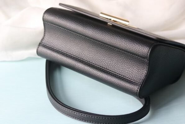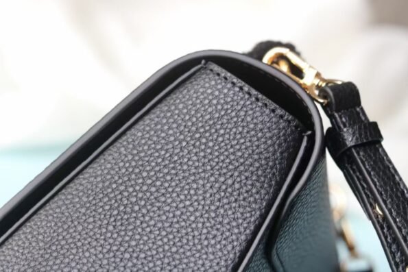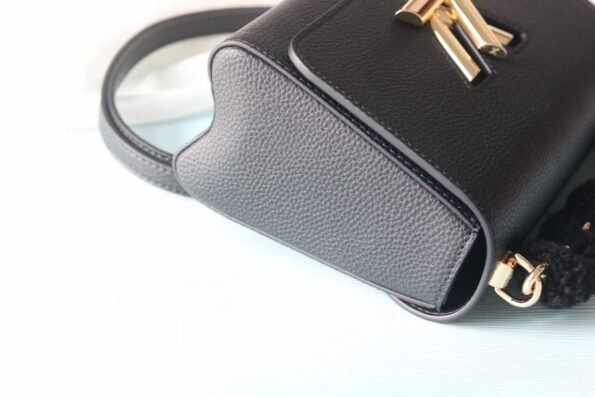 Crafted from soft black cowhide leather. Features adjustable strap, suede lining, and classic LV padlock closure for security. Size: 26x18x7cm.