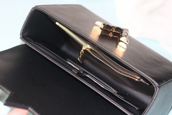 The Twist MM handbag, made from Epi grained leather, features a hand-applied, tone-on-tone enamel LV Twist lock with a quilted effect. It includes an adjustable strap, multiple interior pockets, and showcases Louis Vuitton’s exceptional craftsmanship. Dimensions: 23 x 17 x 9.5 cm.