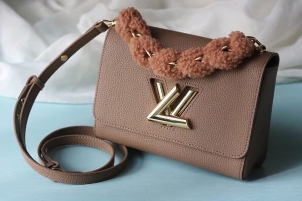 The Twist MM handbag in hazelnut brown Taurillon leather features a cozy detachable braided-shearling chain and an adjustable, removable smart strap. Part of the LV Ski capsule, it offers multiple interior pockets for organization. Dimensions: 23 x 17 x 9.5 cm.