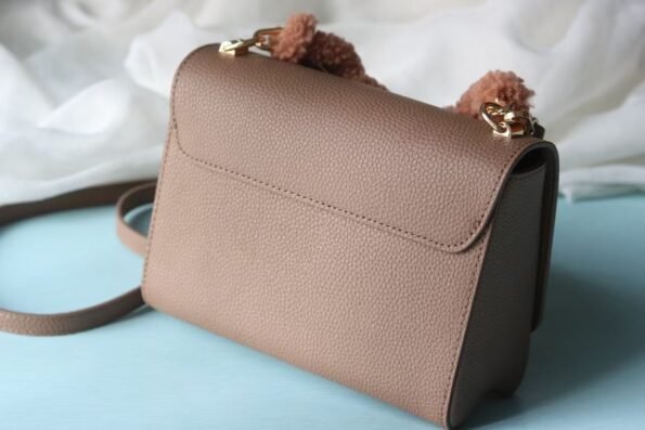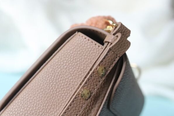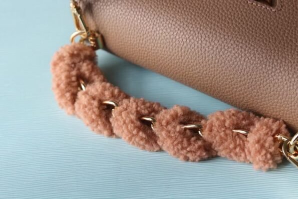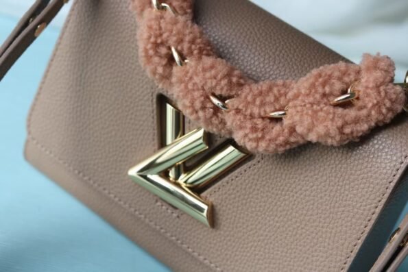 Crafted from Taurillon leather, the Twist MM handbag features a detachable braided-shearling chain and an adjustable, removable smart strap. The hazelnut brown full-grain Taurillon leather combined with the soft shearling on the chain brings a cozy feel, part of the LV Ski capsule. Multiple inside pockets keep everything organized.