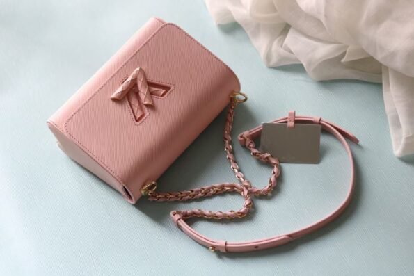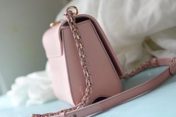The Twist PM handbag in Rose Jasmin Epi leather features a tone-on-tone enamel LV Twist lock with a quilted effect. It offers a spacious “wave” base, a comfortable leather-braided chain, and multiple interior pockets. Dimensions: 19 x 15 x 9 cm.