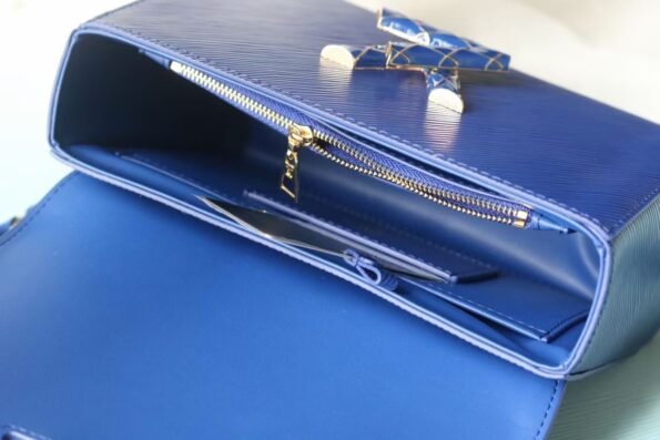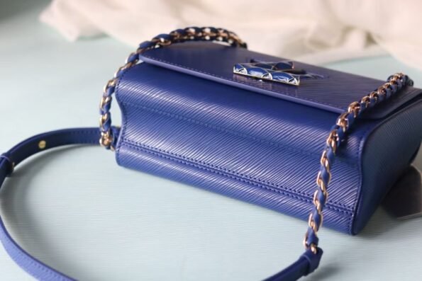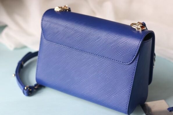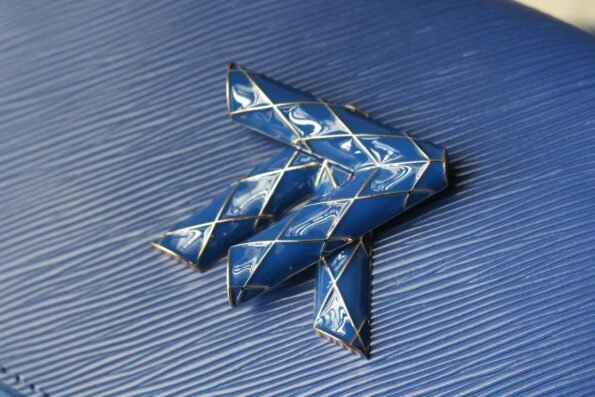 The Twist MM handbag in Smalt Blue Epi grained leather features a hand-applied, tone-on-tone enamel LV Twist lock with a quilted effect. It includes multiple interior pockets, an adjustable strap, and showcases Louis Vuitton’s exceptional craftsmanship. Dimensions: 23 x 17 x 9.5 cm.