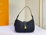 Crafted from soft black cowhide leather. Features adjustable strap, suede lining, and classic LV padlock closure for security. Size: 26x18x7cm.