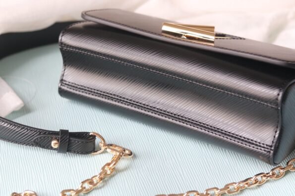 Crafted from Epi leather in vibrant colors. Features signature LV Twist lock, detachable strap & chain for versatile carrying. 23.5x12x7cm.