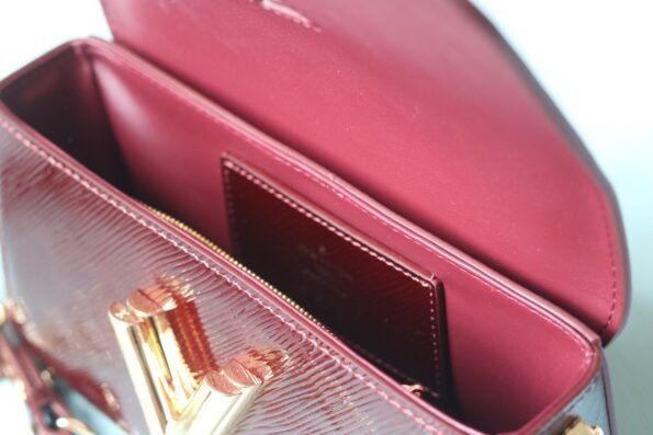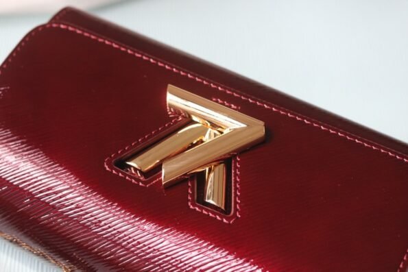 The Twist MM handbag, made from Epi grained leather, features a hand-applied, tone-on-tone enamel LV Twist lock with a quilted effect. It includes an adjustable strap, multiple interior pockets, and showcases Louis Vuitton’s exceptional craftsmanship. Dimensions: 23 x 17 x 9.5 cm.