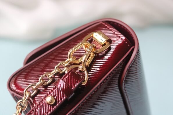 Crafted from Epi leather in vibrant colors. Features signature LV Twist lock, detachable strap & chain for versatile carrying. 23.5x12x7cm.